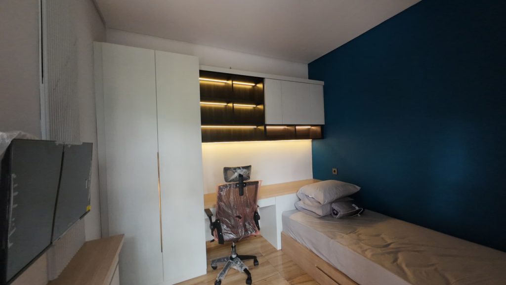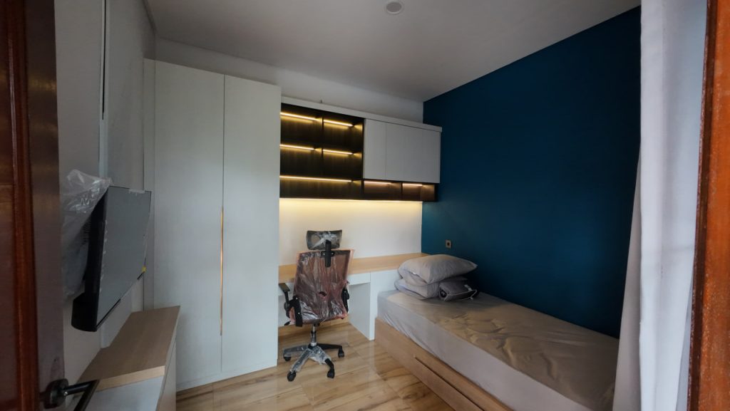 AC ½ PK, SmartTV 32”, Bedset 100×200, Lemari Pakaian,Meja & Kursi Belajar, Rak Buku, Jaringan WiFi